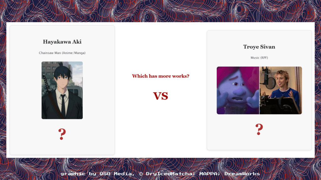 The AO3dle covered comparatively more familiar ground, as I have dabbled in reading the occasional fanfic over the years. Not many, though – and from a very limited range of fandoms. As a result, I had to deploy the same line of reasoning when assessing which character had more fanfiction to their name. After all, I’m not exactly elbow-deep in Supernatural fanfiction, and I don’t even recognise the subjects of half the real-person fiction (RPF) that comes up on the daily challenge.
